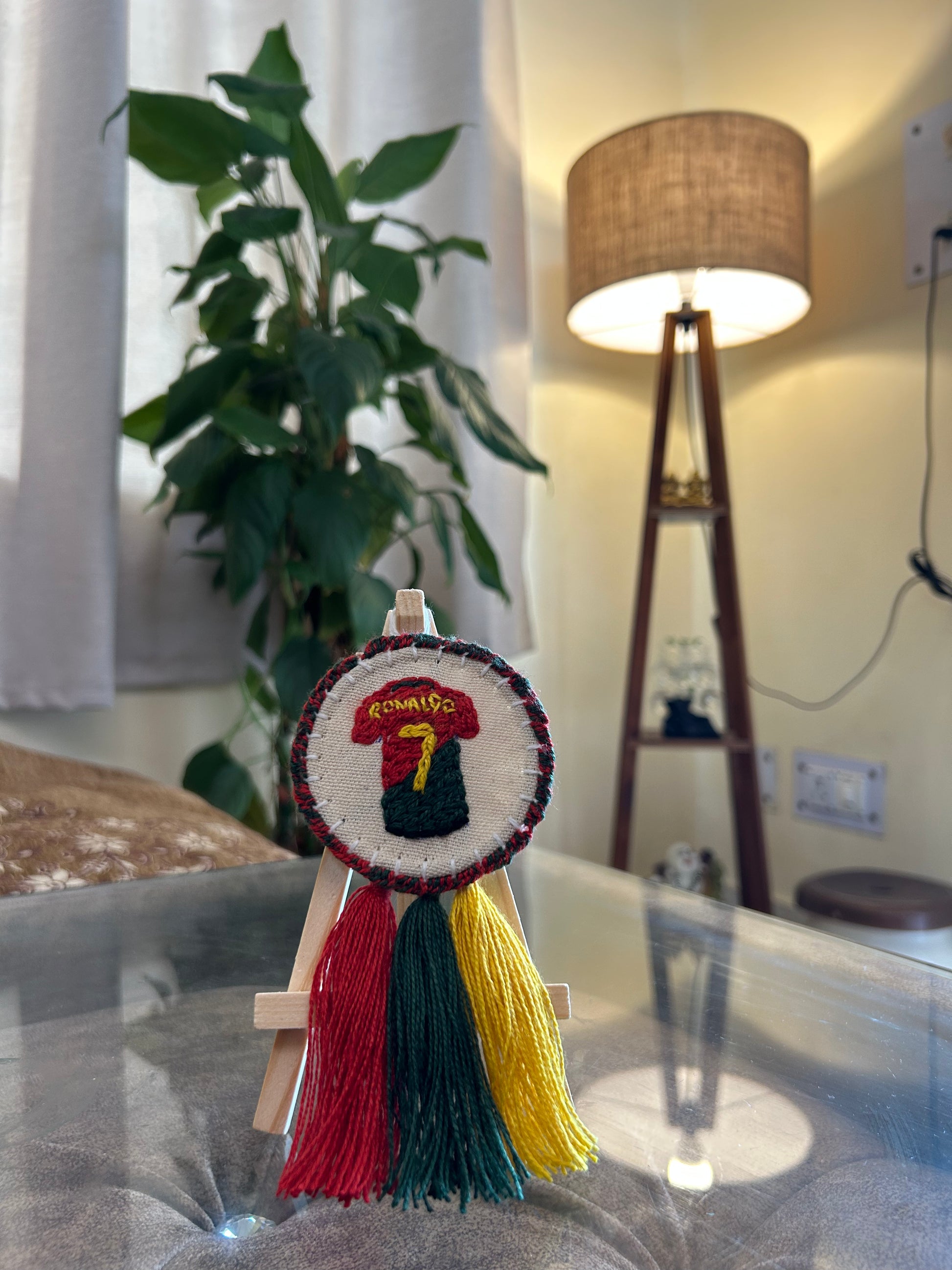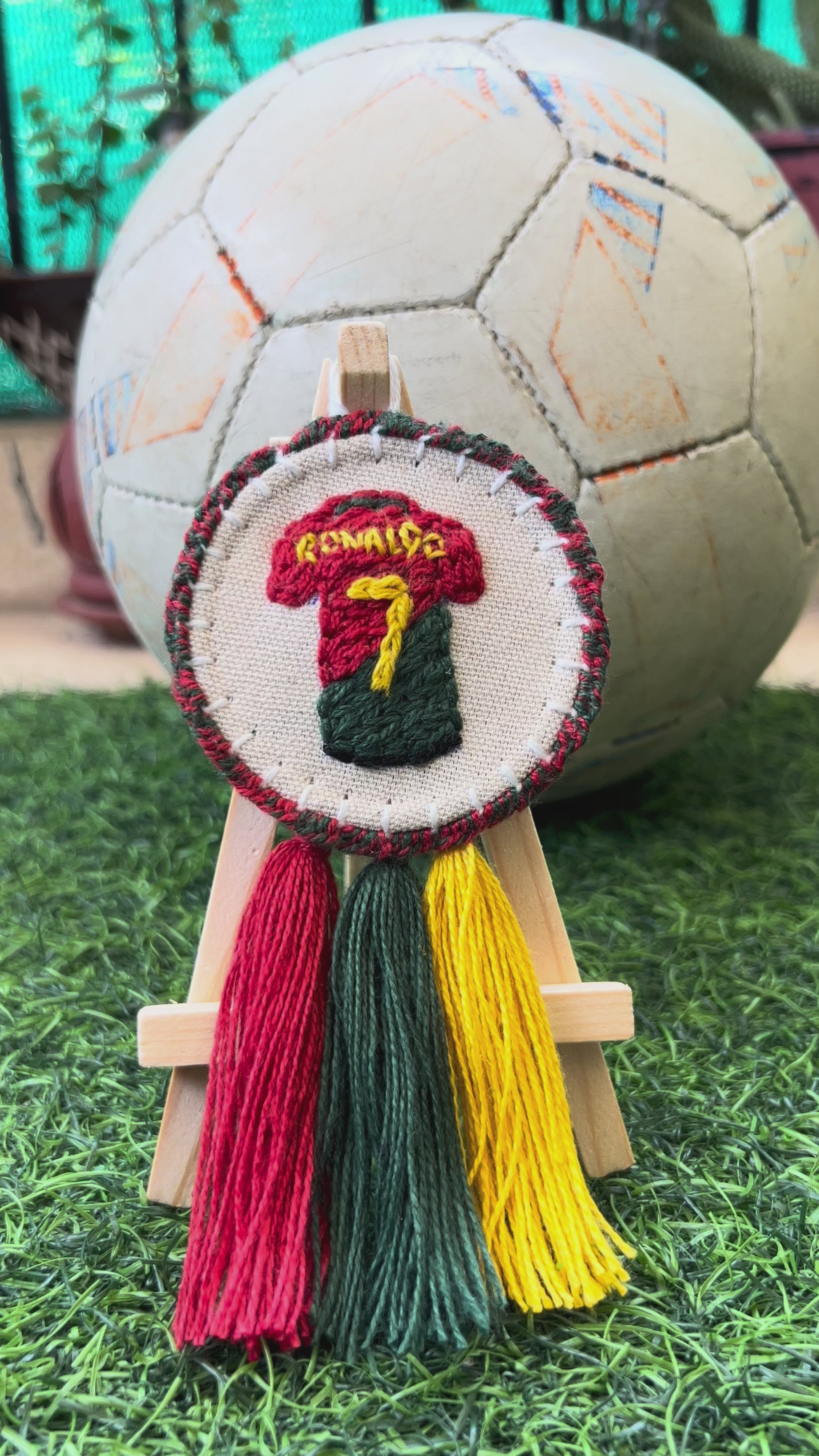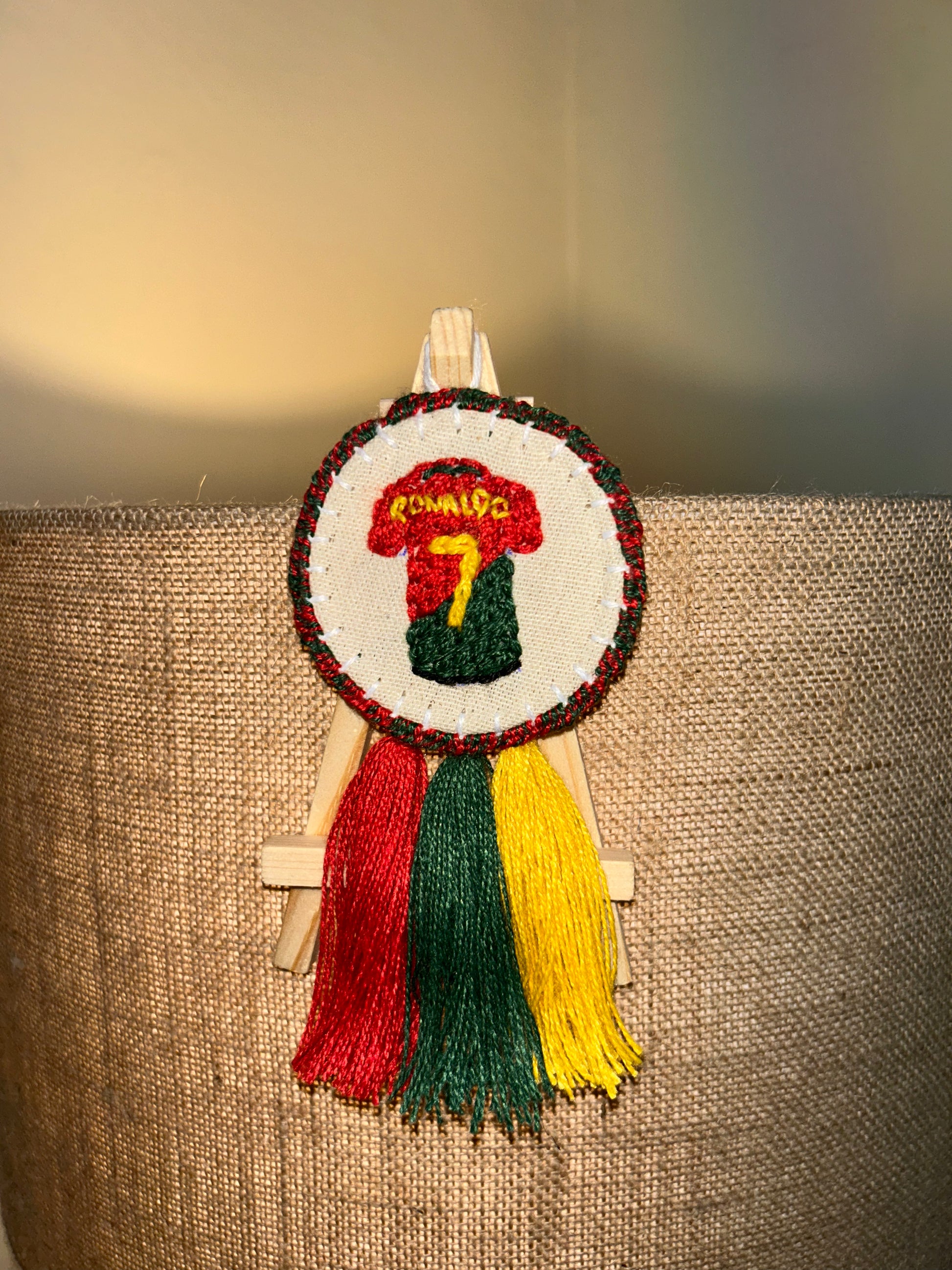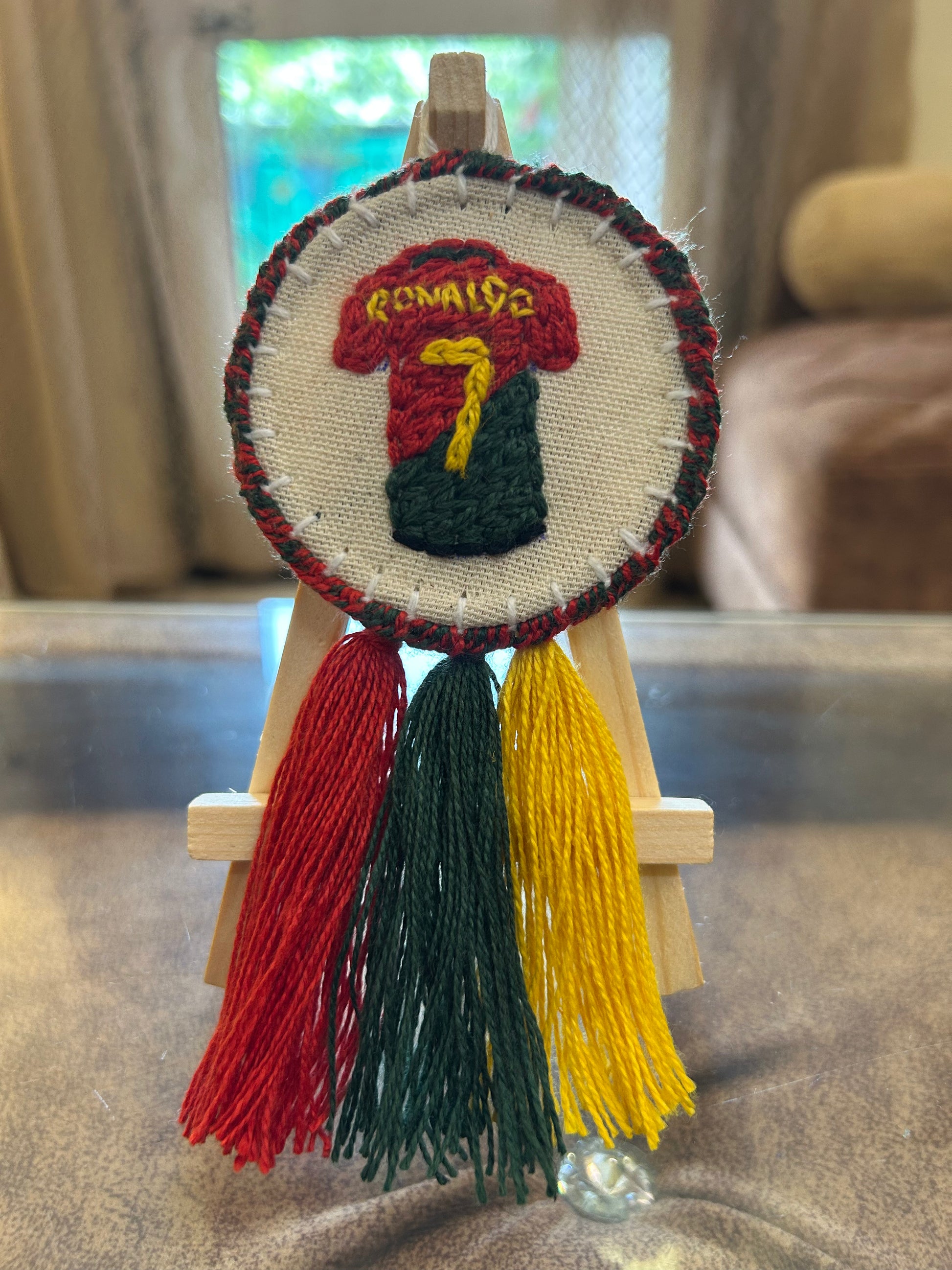 Cristiano Ronaldo #7 embroidered art piece. Hand-stitched with vibrant red, green, and yellow threads, this circular masterpiece captures the iconic jersey design in a charming mini-format. Hung on a mini wooden easel and detailed with tricolored tassels, it’s the perfect desk or wall accessory for any Ronaldo or football fan.