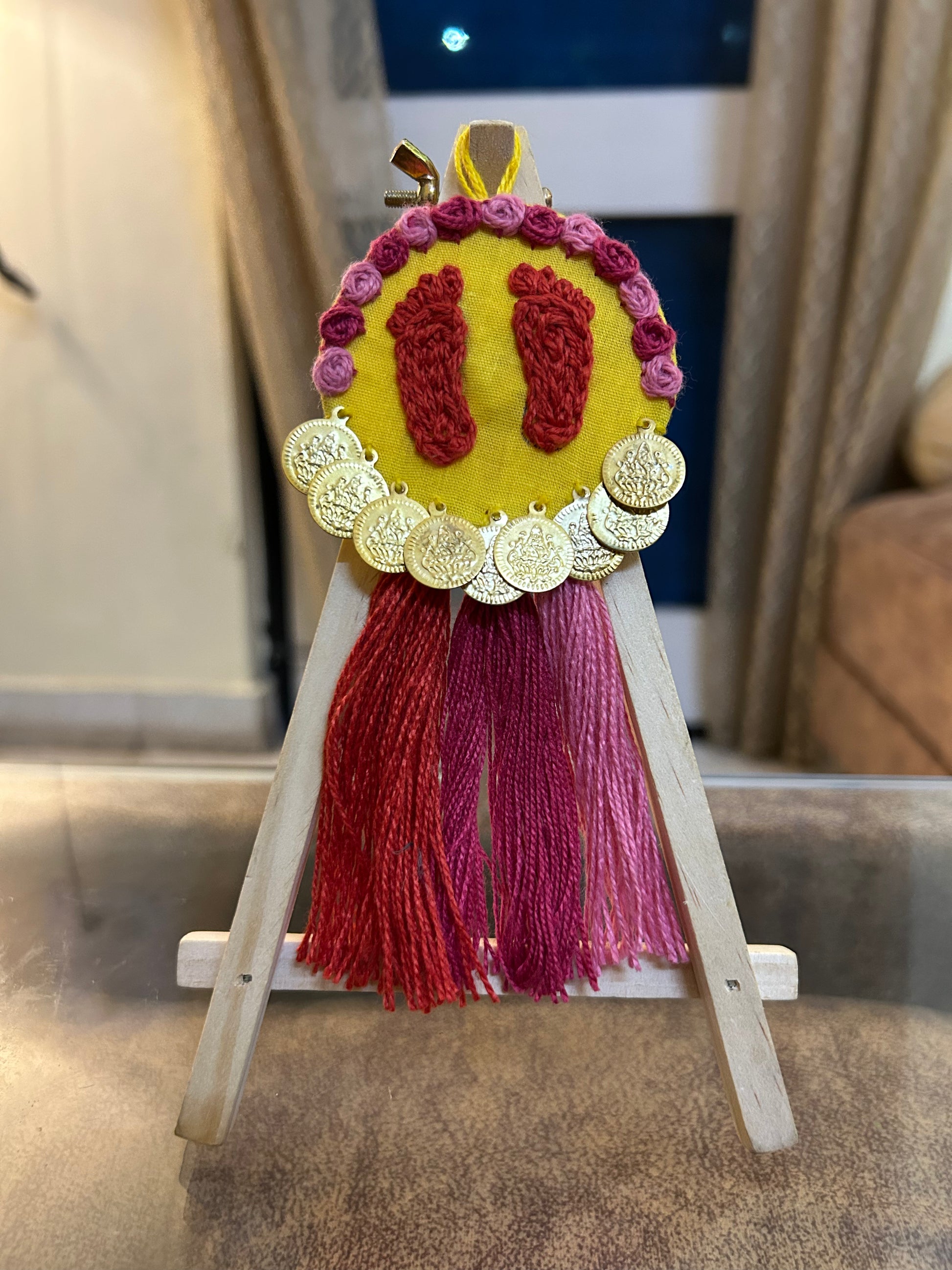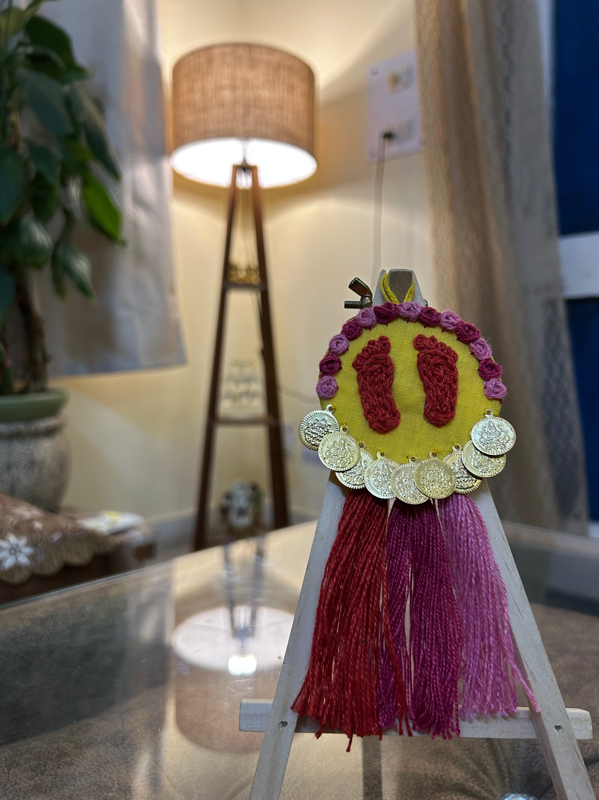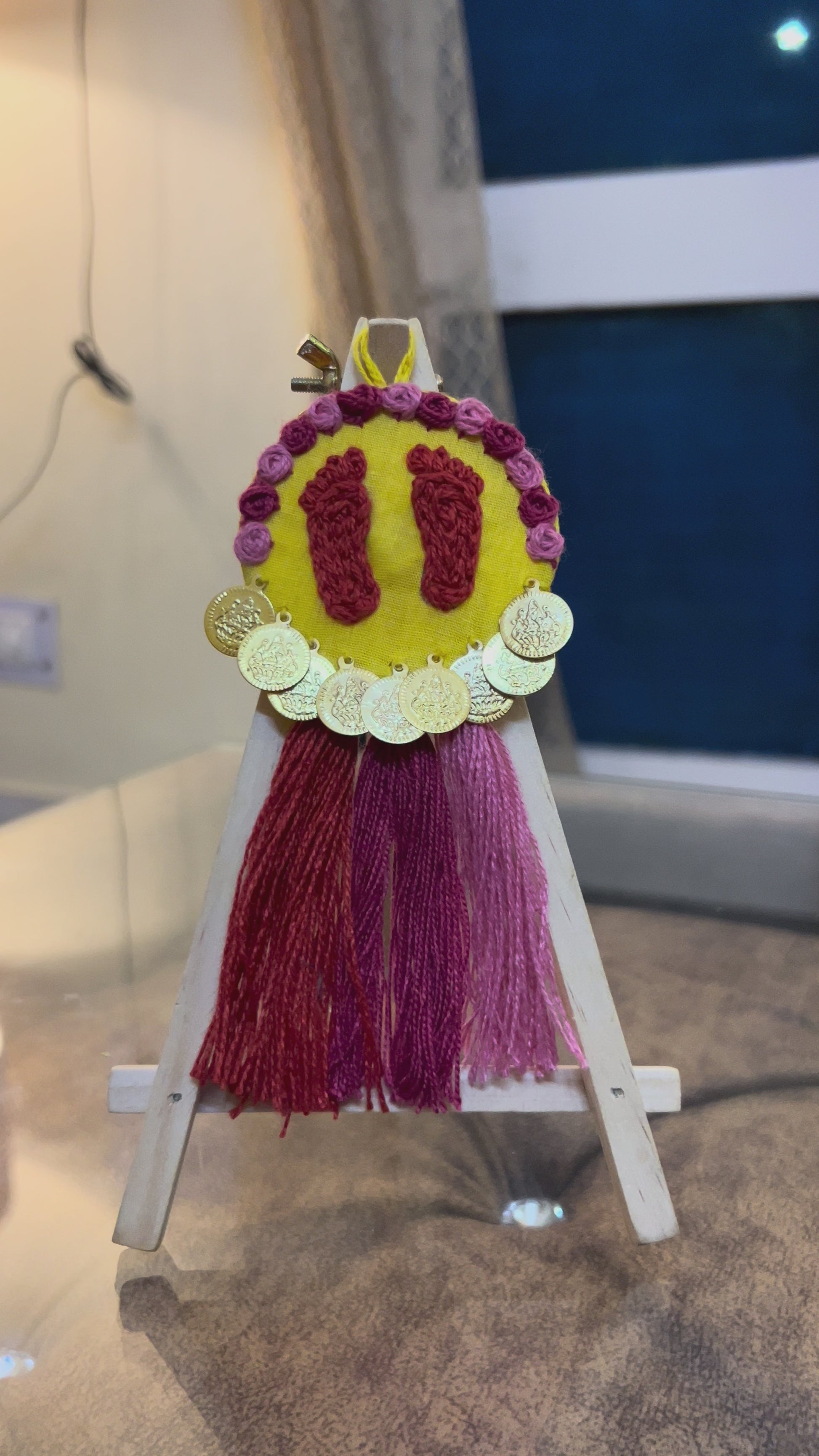 Invoke the presence of Goddess Lakshmi with these divine red footprints handwoven on a golden yellow backdrop. Symbolizing wealth, purity, and fortune, this charm is ideal for Diwali décor, gifting, or placing near your locker, workspace, or mandir.