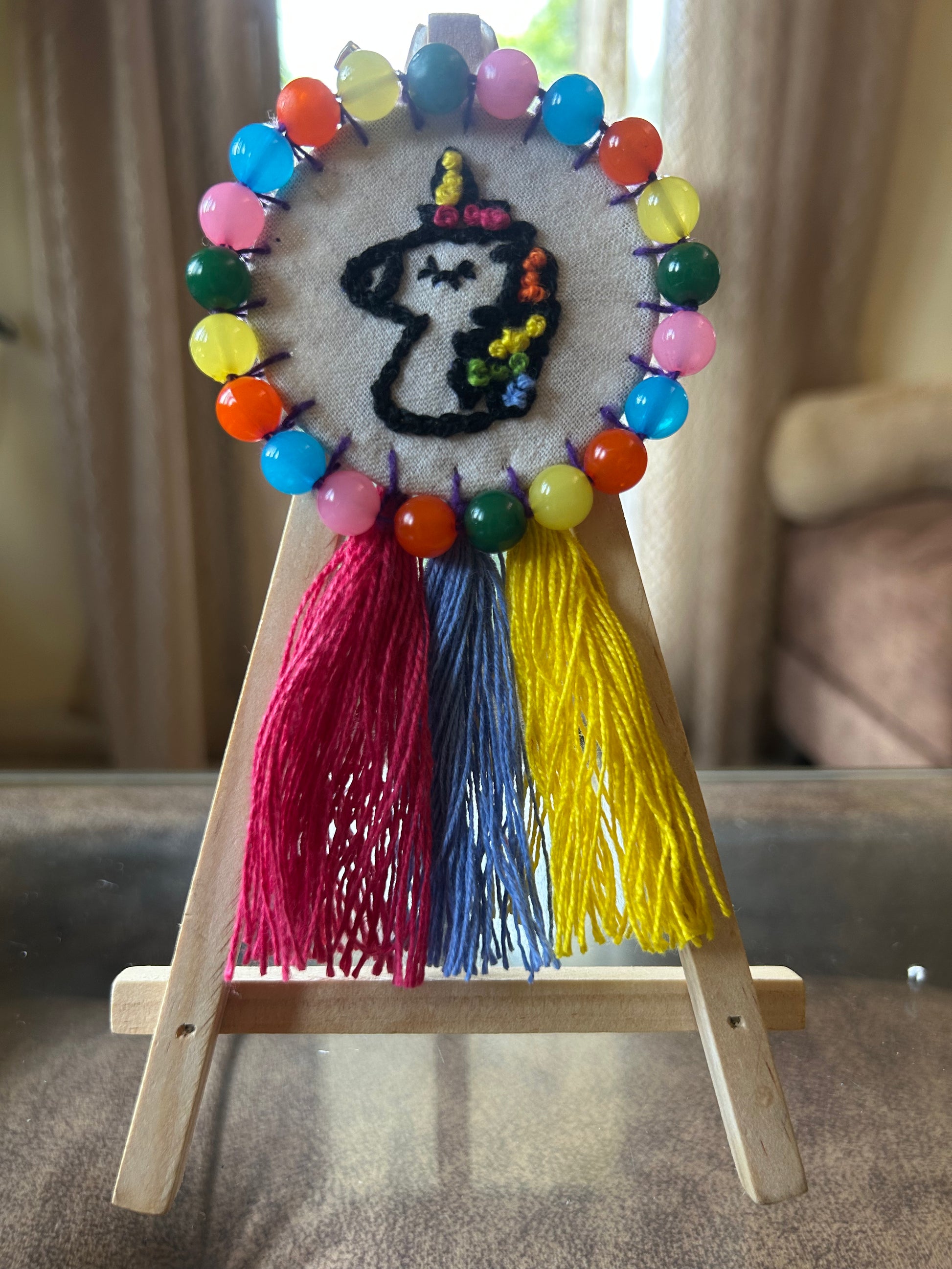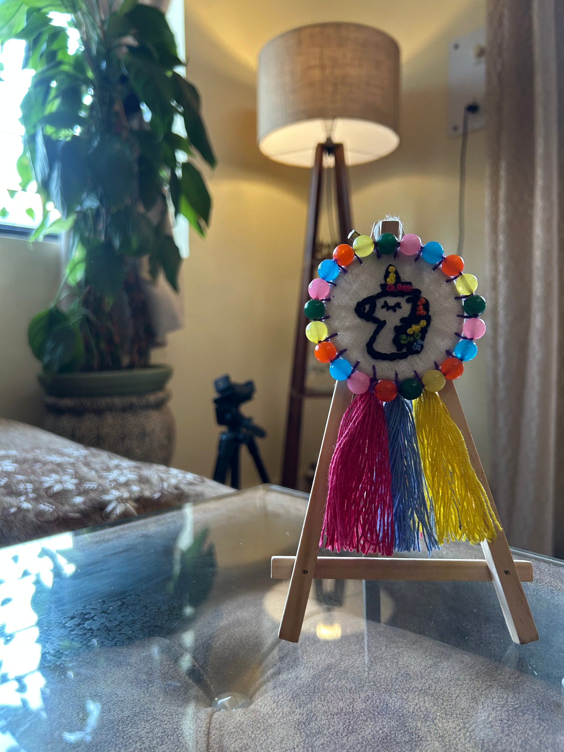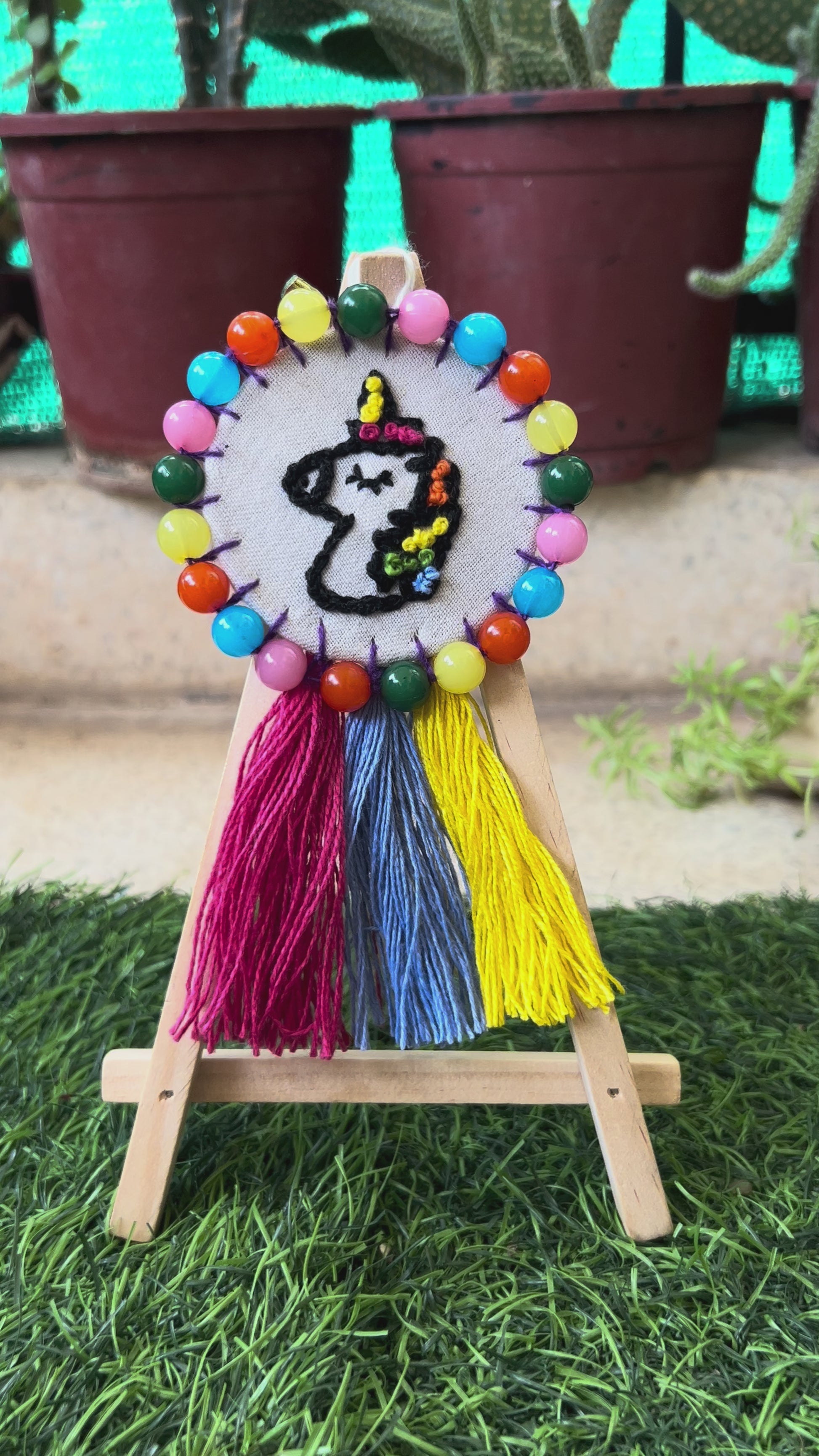 Embroidered with a dreamy unicorn and wrapped in vibrant beads and tassels, it’s made to brighten your room, bag, or mood. 🦄✨