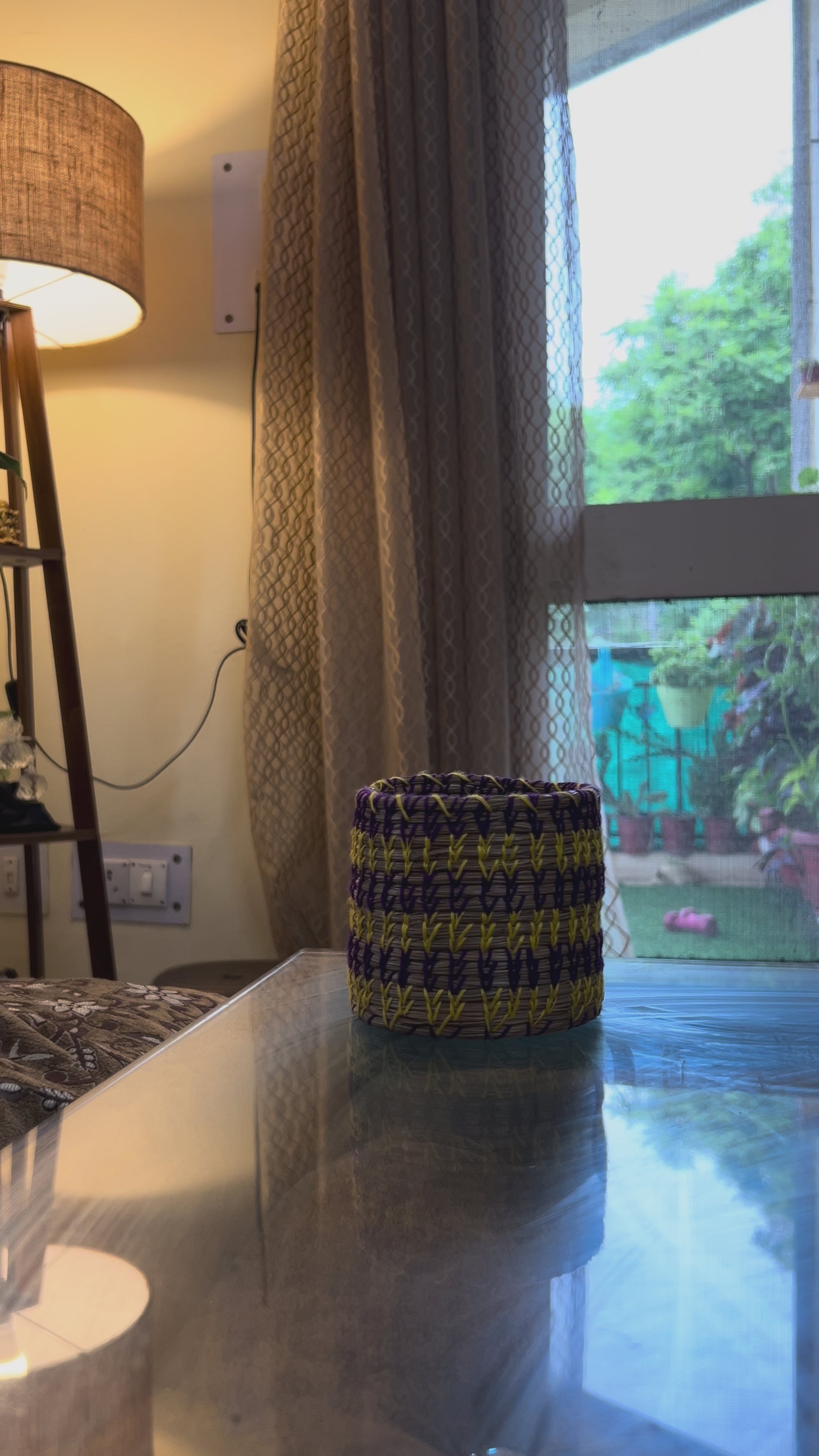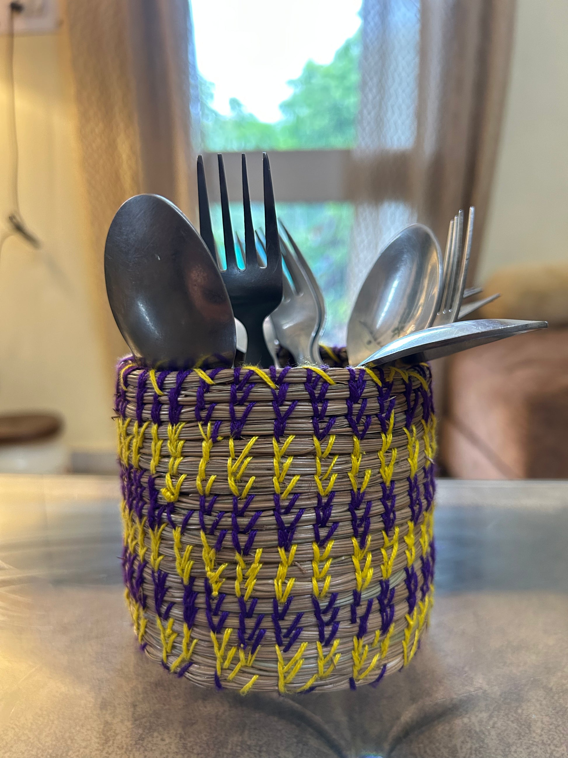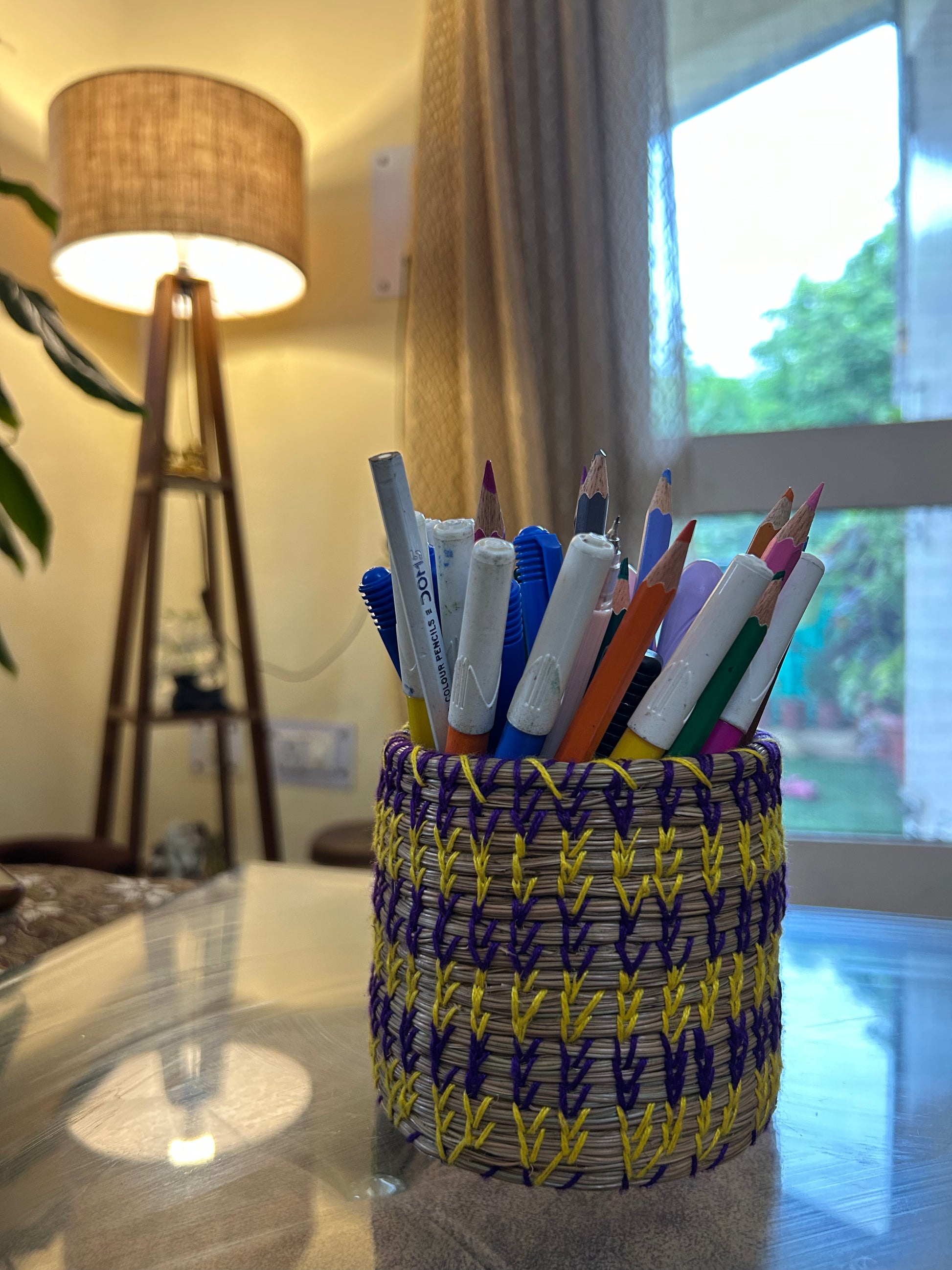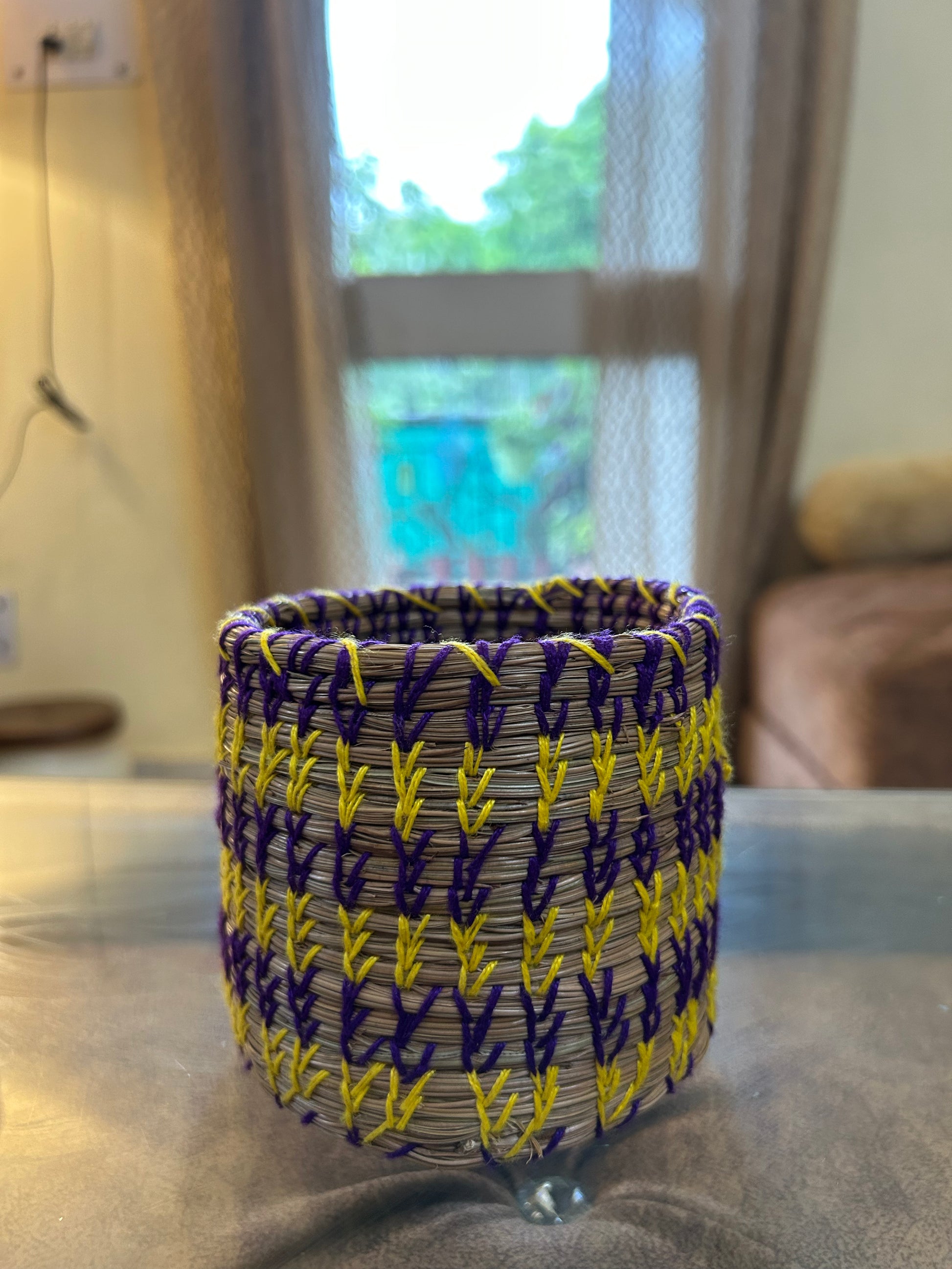Transform your desk into a colorful oasis with this handwoven pine basket, stitched in bold purple and yellow threads for a pop of playful charm. The perfect home for your pens, brushes, or trinkets—keeping your space organized and your creativity flowing.