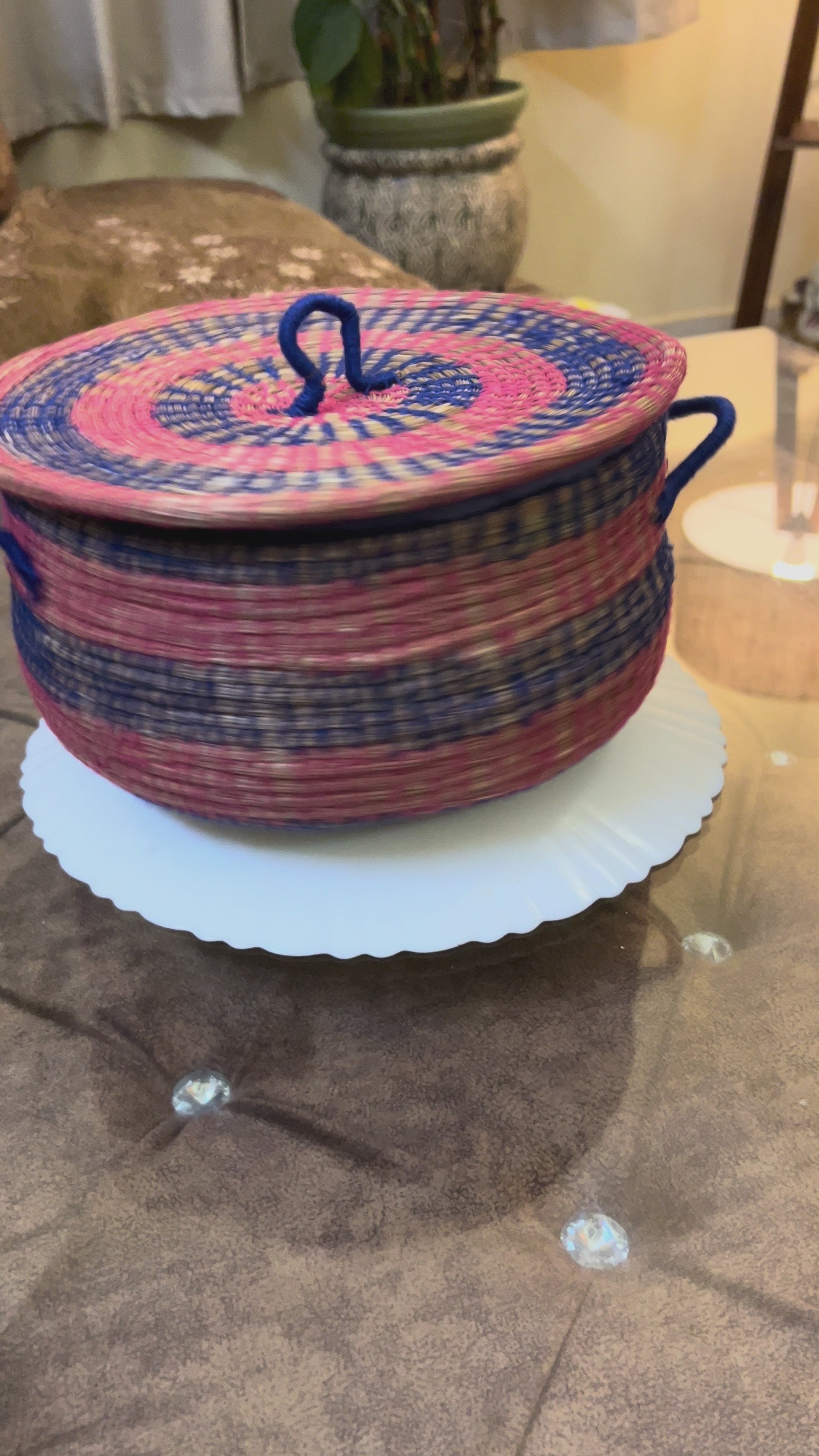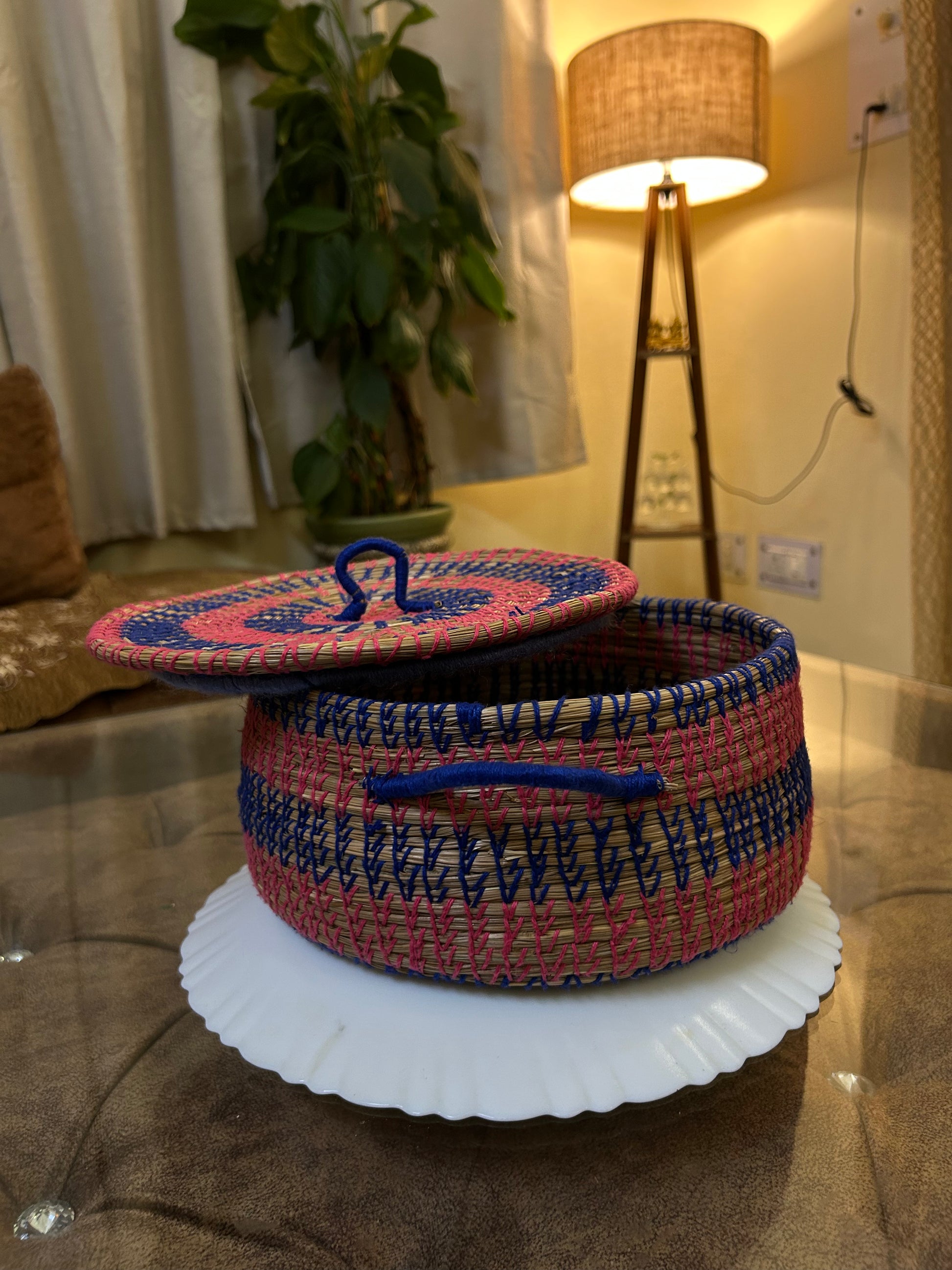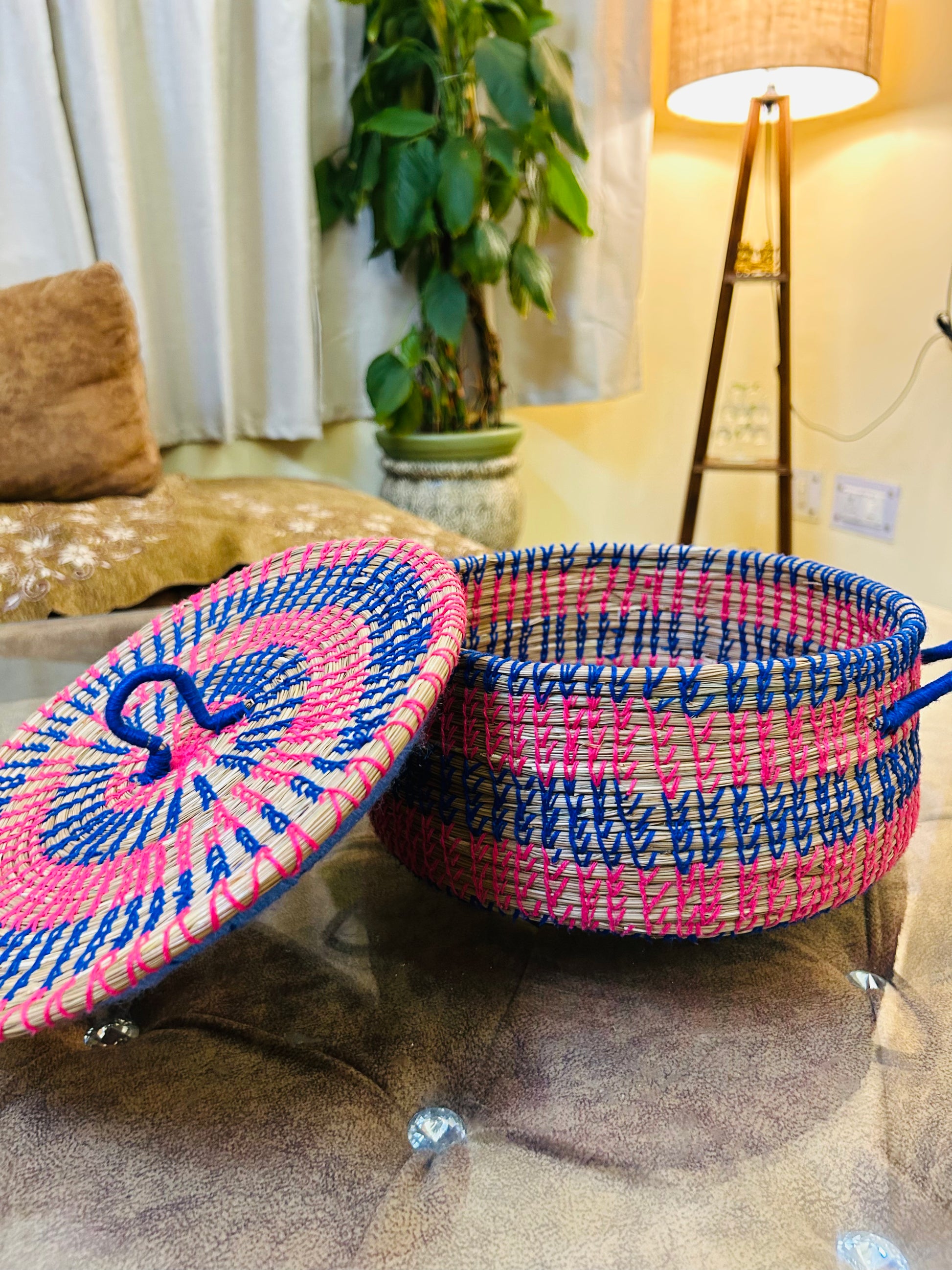 A soft yet sturdy handwoven basket made from pine straw and cotton thread, designed to hold anything from dry snacks to keepsakes and jewelry. The lid keeps your treasures tucked away while its colorful design adds a vibrant charm to your shelves or desk.