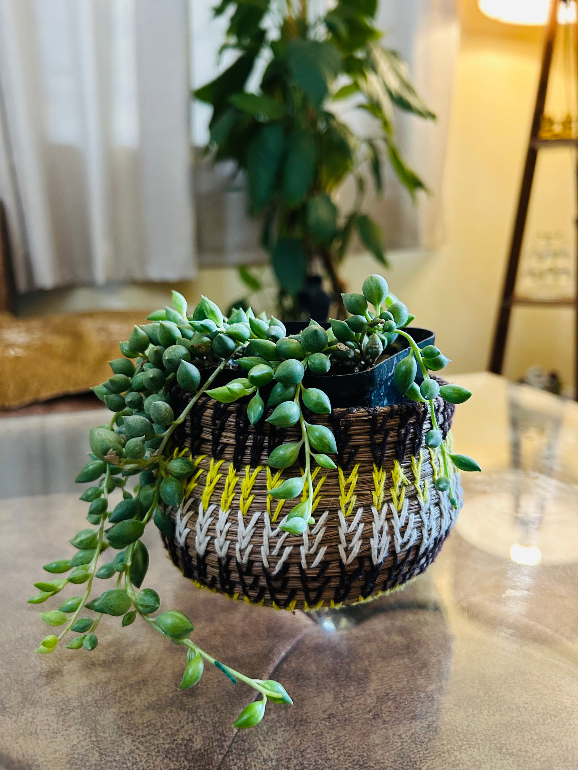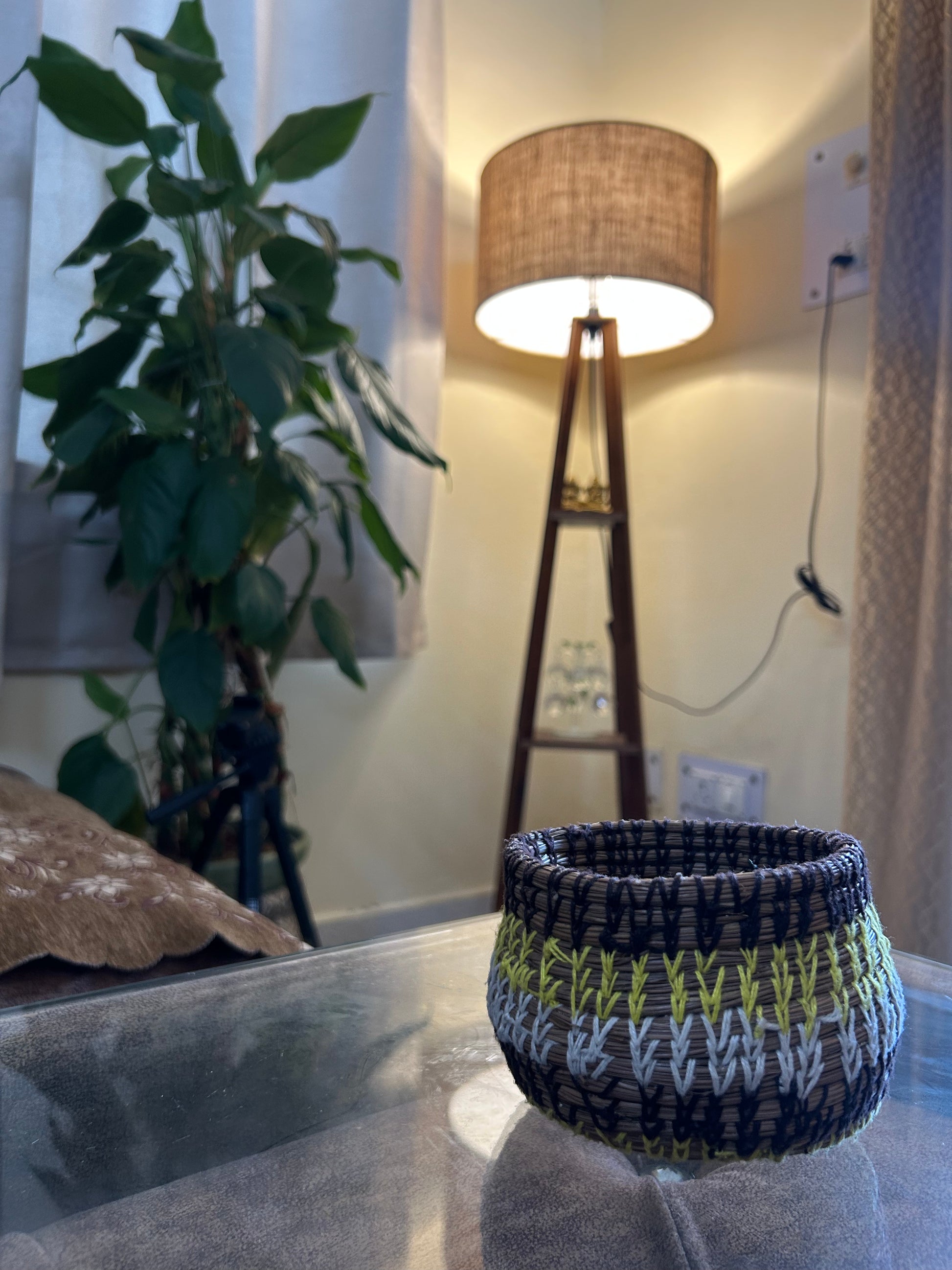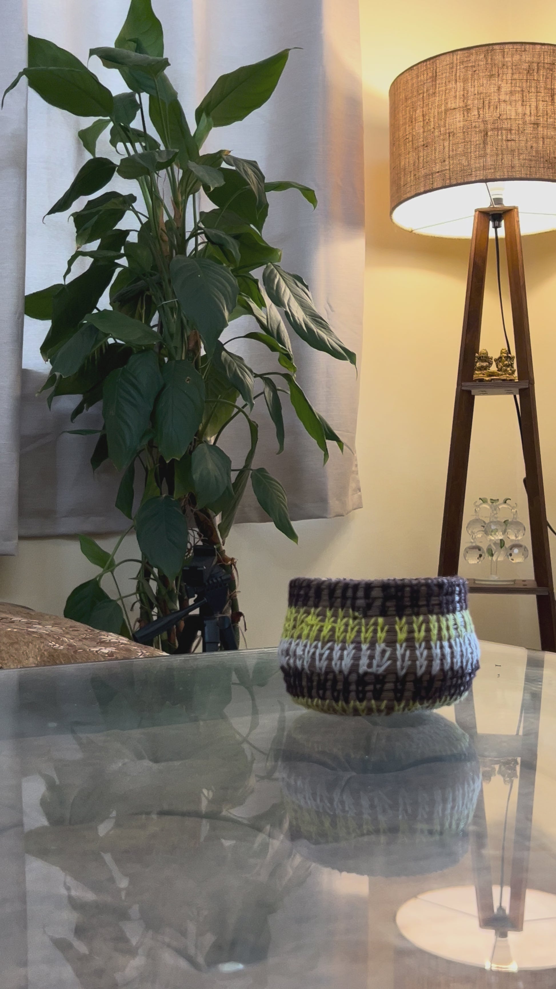 Add natural elegance with our unique handwoven basket, perfect for stylish storage or a standalone accent. Meticulously crafted from sustainable fibers with distinctive [mention dominant colors, e.g., natural, black, lime green, white] patterns, each piece is truly one-of-a-kind.
