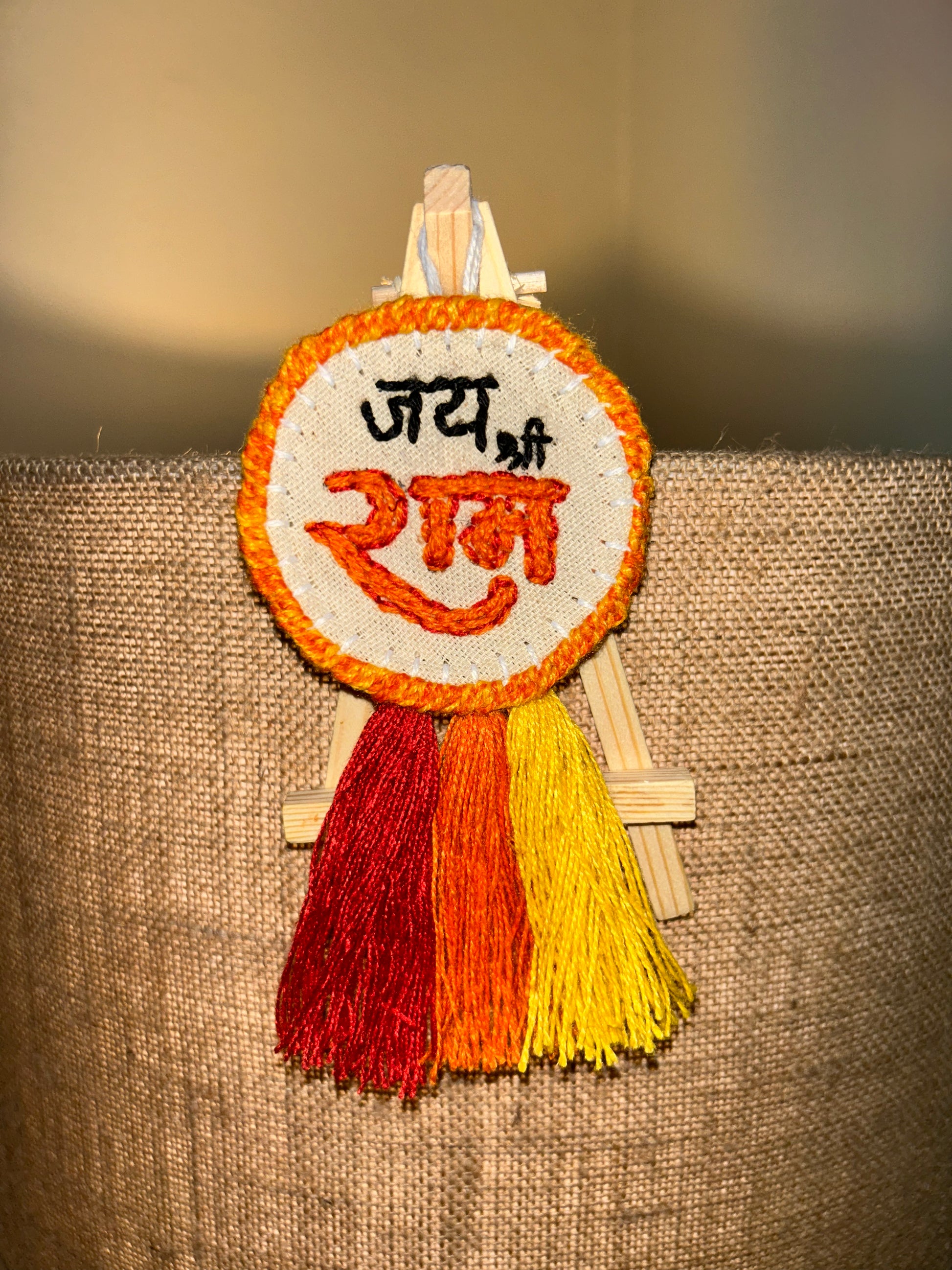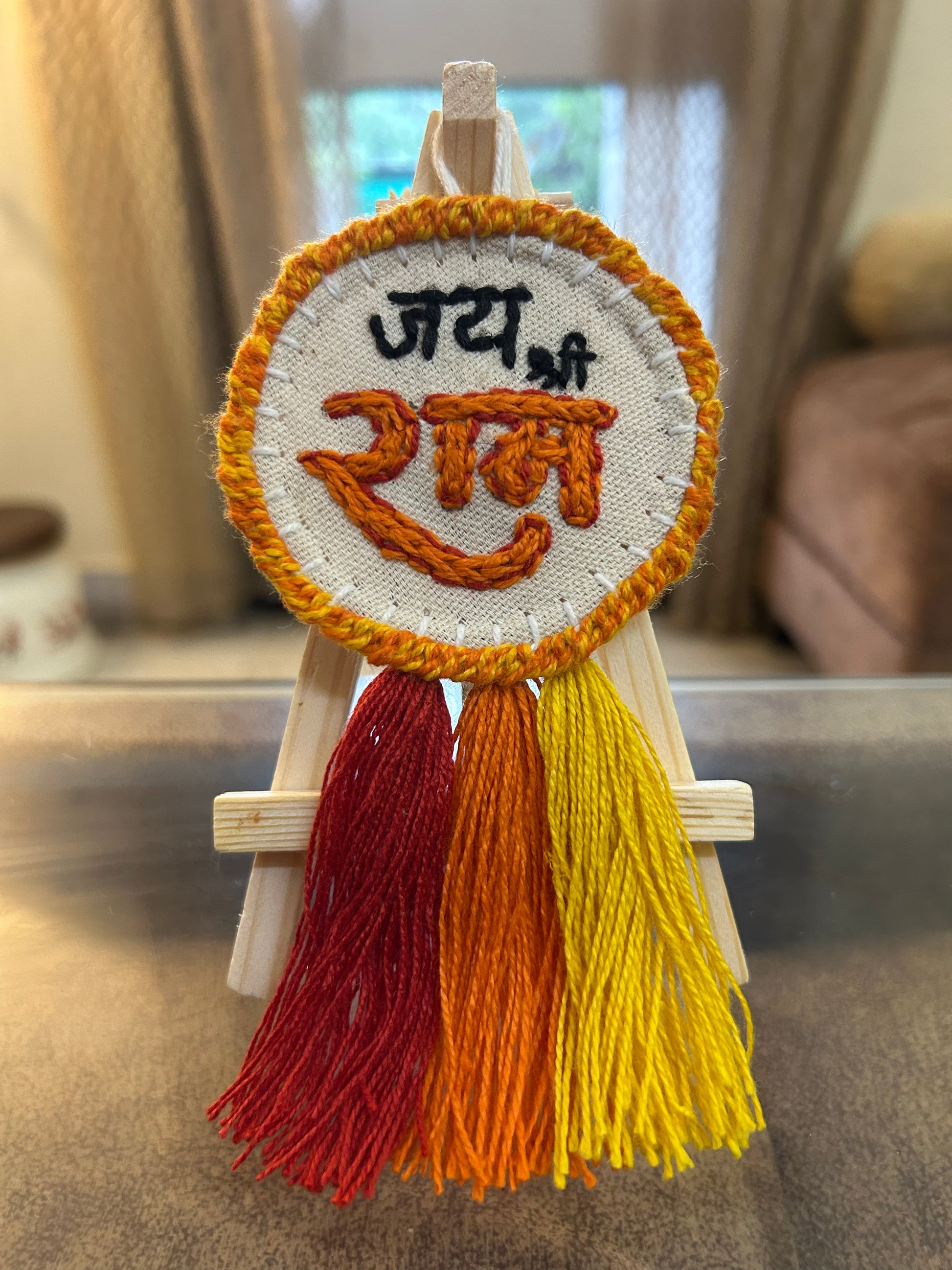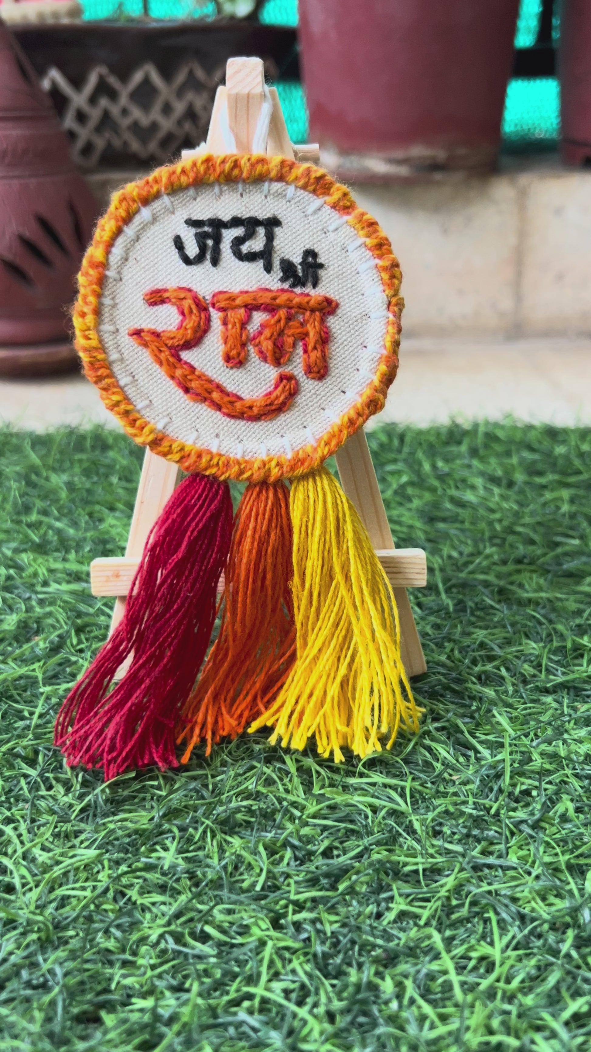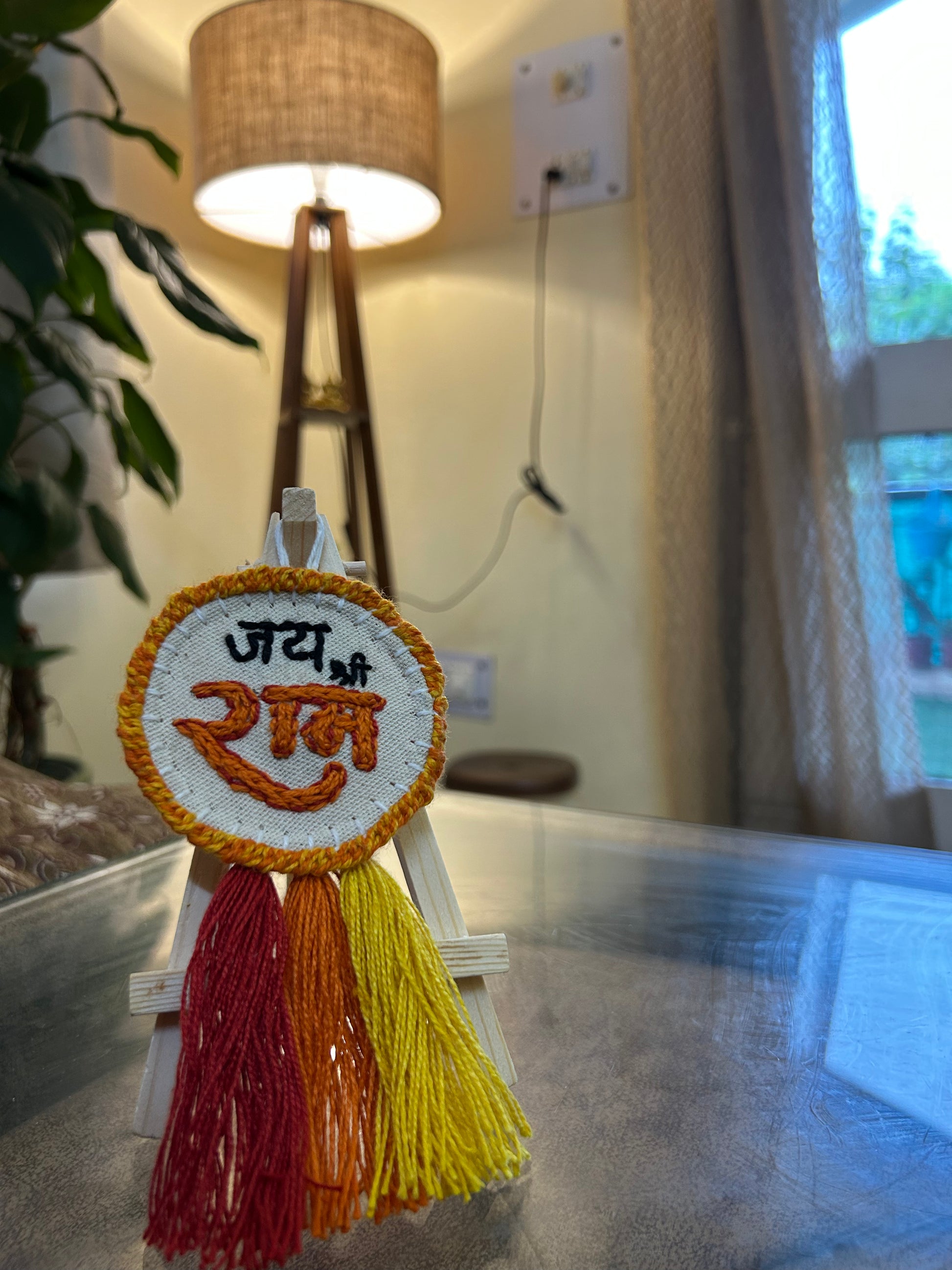 Invoke the sacred energy of Lord Rama in your space with this Jai Shri Ram Divine Charm. Hand-embroidered on a sturdy fabric hoop, the bold saffron and white threads bring home the spirit of devotion, while the vibrant tri-color tassels add a pop of festive cheer. Hang it in your car, meditation corner, puja altar, or living room to bless every moment with courage, virtue, and grace.